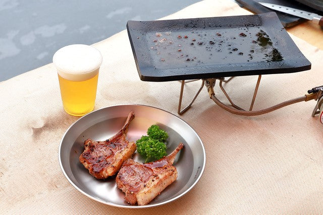 鉄板からの油汚れを防ぐため、4方向に曲げ加工を施しています。これにより、肉汁や食材から出る水分が滴り落ちることを防ぐことができます。